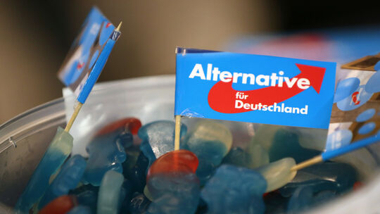 Mit blau-roten Gummibärchen verköstigt die AfD Besucher bei Wahlveranstaltungen. In der NAOS in Diez hatte Jan Bollinger keine Süßigkeiten, dafür aber Botschaften für die Schüler dabei. Hannibal Hanschke. picture alliance / dpa