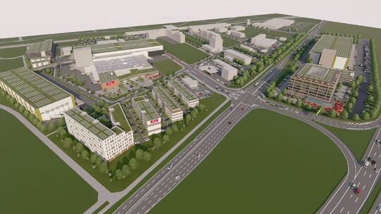 So stellt sich das bereits im ICE-Gebiet Limburg angesiedelte Unternehmen eines Tages seinen „Bäckercampus“ vor: Der bestehende Standort links soll sich deutlich vergrößern, unter anderem durch die Vergrößerung der Backwerkstatt sowie den Bau eines Parkhauses und eines Logistikzentrums. hsprojekt/Schäfer Dein Bäcker