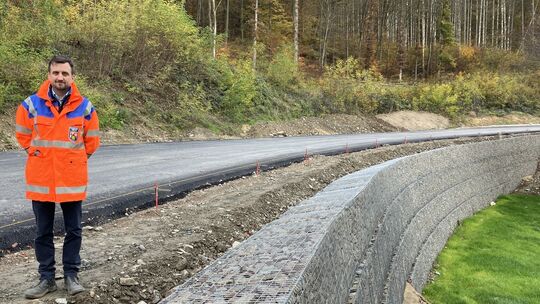 Entlag der L335 wurden Gabionenwände mit bis zu vier Meter Höhe mit Rückverankerung zur Minimierung des Eingriffs in vorhandene Biotopflächen hergestellt, berichtet Benedikt Bauch, Leiter des LBM Diez. Mira Zwick