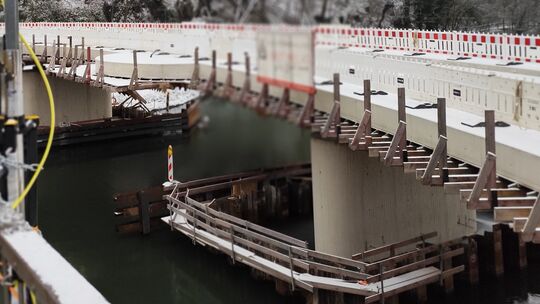 Ab Februar sollen Hilfskonstruktionen, wie die um die Brückenpfeiler errichteten Spundwandkästen, aus der Lahn entfernt werden. Johannes Koenig