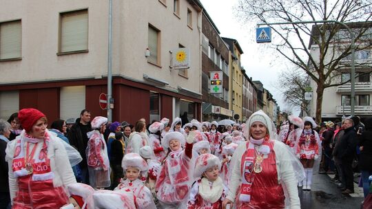 Die jüngsten des Carneval Comité Oberlahnstein beim – leider verregneten – Rosenmontagszug 2019 in der Adolfstraße. Wegen diverser Umleitungen durch die Brückensperrung wird der Zug im kommenden Jahr eine etwas veränderte Strecke laufen. Karin Kring
