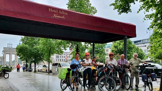 Zum Start ihrer Radtour über 700 Kilometer gönnten sich (von rechts) Fritz Schornick, Walter Lotz, Georg Peiter, Birgit Schornick und Uschi Peiter und Christel Lotz eine Übernachtung im legendären Hotel Adlon in Berlin. Dann ging es los in Richtung Rhein. Foto: Georg Peiter Schornick