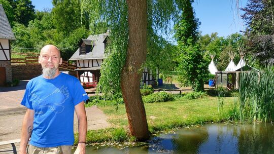 Idylle mit Teich, Tipis und Fachwerkhäusern: Der Pädagoge Thomas Hübner hat die Unterste Harbacher Mühle in Weisel gekauft und zu einer Begegnungsstätte gemacht, die allem voran der Entschleunigung in der Natur des Welterbes Oberes Mittelrheintal dienen soll. Fotos: Andreas Jöckel aj