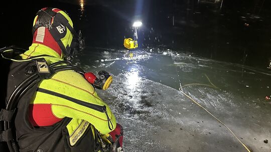An der Lahnsteiner Schleuse trainierten die Taucher der Feuerwehren Lahnstein und Koblenz die Suche und Rettung von Personen unter der Eisfläche - eine besondere Herausforderung für die Einsatzkräfte. Anja Kratz/Feuerwehr Lahnstein
