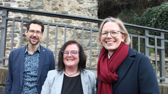 Der SPD-Landtagsabgeordnete Manuel Liguori, Ortsbürgermeisterin Michelle Wittler (Mitte) und Staatssekretärin Simone Schneider fruen sich über den Abschluss der Arbeiten am Schiefen Turm Dausenau. Andreas Galonska