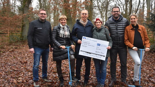 Die Firma Heinrich Schwarz hat der Stadt Diez 20.000 Euro für Maßnahmen im Stadtwald Hain gespendet. Den symbolischen Scheck nahm Stadtbürgermeisterin Annette Wick (Dritte v. rechts) entgegen. Den Scheck übergaben Karl-Heinz Schwarz (Dritter v. links) mit Ehefrau (Zweite v. links), Tochter Caroline Laux-Schwarz (rechts), ihr Mann Raphael Laux (Zweiter v. rechts) und Verkaufsleiter Axel Saueressig (links). Mariam Nasiripour