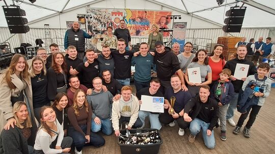 Der Jubel war groß, als Ortsbürgermeister André Stötzer (oben 2. von rechts) zusammen mit (oben von links) Marktmeister Marcus Neurohr, der Vorsitzenden des Marktausschusses Bärbel Christ und der Beigeordneten Andrea Köhler die Abstimmungsergebnisse der beliebtesten Festzugteilnehmer bekannt gab. Die meisten Stimmen erhielten die „Junge Bouwe“ als Racing-Team. Bernd-Christoph Matern