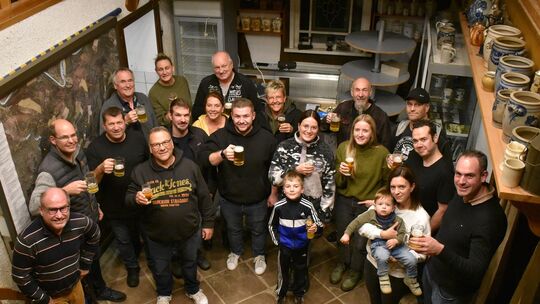 „Zum Wohl!“. Während eines Helferfestes in der Heimatstuben dankte Singhofens Ortsbürgermeister Detlef Paul (links) den vielen Freiwilligen, die unter Anleitung von Marvin Schmidt (rechts) den Marktplatz in der Dorfmitte in hunderten ehrenamtlichen Stunden saniert haben. Bernd-Christoph Matern