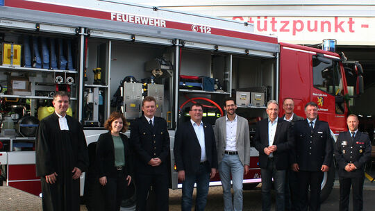 Die Indienststellung des neuen Fahrzeuges lockte (von links) Pfarrer Oliver Sigle, Verbandsbürgermeisterin Maren Busch, Brand- und Katastrophenschutzinspekteur Guido Erler, die Landtagsmitglieder Manuel Liguori (SPD) und Matthias Lammert (CDU), Günter Groß, stellvertretender Fraktionsvorsitzender der CDU im Kreistag, Marcus Grün, Wehrleiter der Verbandsgemeinde, und Alexander Ott, Wehrführer der Einheit Holzappel, an. Willi Schmiedel