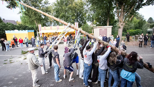 Mit einer Stunde Verspätung konnte der Baum auf der Flachter Kirmes endlich gestellt werden. Rolf Kahl
