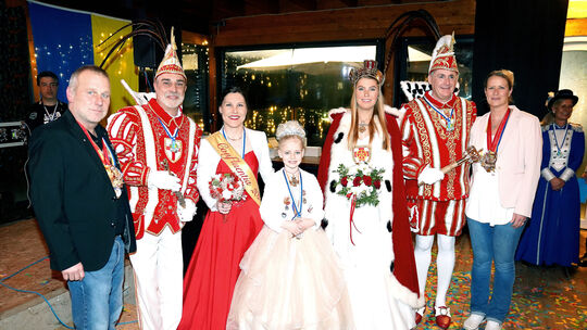 Koblenzer Tollitäten Lars und Kim, Emser Prinzessin Melina, Lahnsteiner Tollitäten Sascha und Sira, eingerahmt von Oliver und Jessica Schupp Dirk Förger