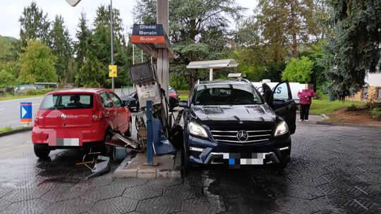 Unfall an einer Tankstelle in Hahnstätten: Ein Fahrzeug beschädigt eine Zapfsäule. Eingeschränkter Tankstellenbetrieb geht weiter.