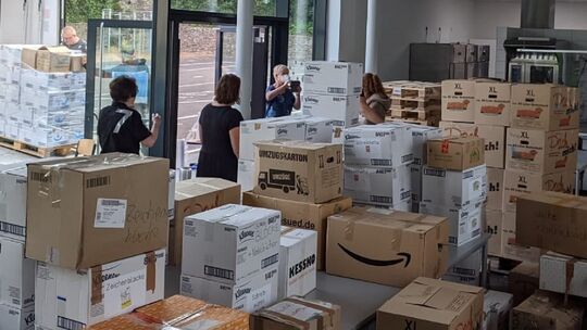 Mehr als 220 Umzugskartons prall gefüllt mit Schulranzen und allem, was Kinder für den Schulstart brauchen, gingen von der Lahnsteiner Goetheschule aus auf die Reise nach Bad Neuenahr-Ahrweiler zur Aloisius-Grundschule. Foto: Goetheschule Lahnstein Goetheschule Lahnstein