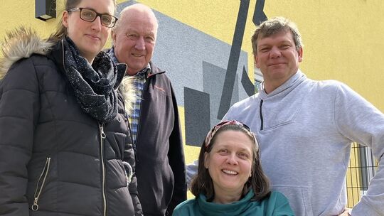Kerstin Schönfelder vor ihrem neuen Zuhause in Miehlen mit (von links) Assistentin Sabrina Jannig, RZ-Leser Volkmar Heuser und dessen Sohn und Vermieter Dag Heuser. Marta Fröhlich