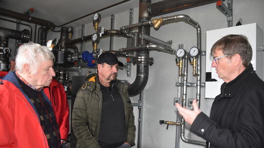 Im Technikraum, das das gesamte Baugebiet versorgen wird, erklärt Bernhard Meyer (rechts) von der Elevion Energy Solutions die Technik. Mariam Nasiripour
