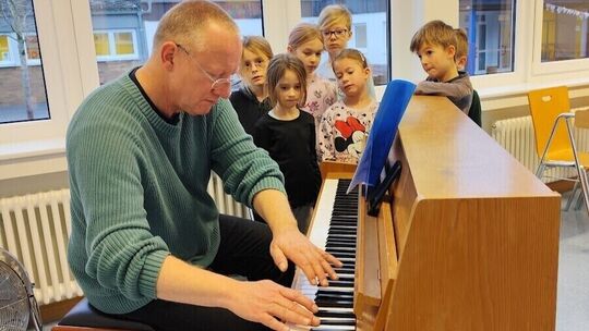 Ralf Schohl bringt Schülern der Klasse 1a der Grundschule im Einrich in Katzenelnbogen im Rahmen des Instrumentenkarussells das Klavier näher. Johannes Koenig