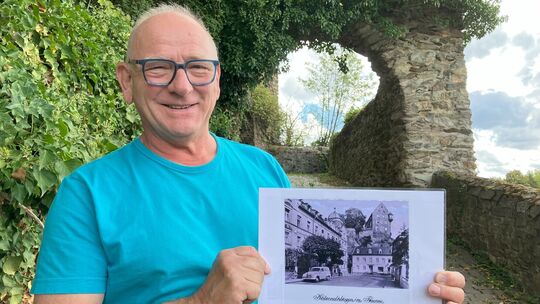 Vor dem Zugang zum Glockenturmtor zeigt Harald Gemmer eine historische Aufnahme des Schlosses. Johannes Koenig