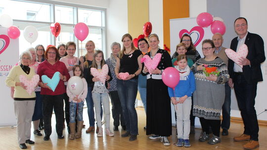 Auch sieben Jahre nach dem ersten Treffen sind rund 20 Gruppenmitglieder in Braubach zusammengekommen, um die bunten, herzförmigen Kissen anzufertigen. Das freut auch Initiatorin Alexandra Weber (Mitte) und VG-Bürgermeister Werner Groß (rechts). Foto: Ulrike Bletzer Ulrike Bletzer