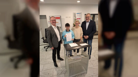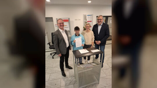Dieter Knopp, Geschäftsführer operativ der Arbeitsagentur in Montabaur, Achim Gutwald, Geschäftsführer der Caritas Werkstätten und Heike Göbel, Teamleiterin der Eingangszone, freuen sich, dass Eric Seifert als "Lotse" in der Arbeitsagentur in Lahnstein arbeitet. Tobias Lui