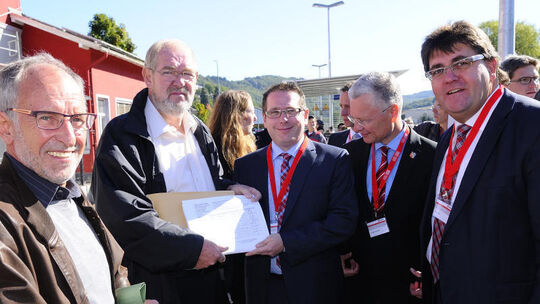 Übergabe (von links): Obernhofs Ratsmitglied Heinrich Stritter und der Beigeordnete Hans-Christian Hahn reichen die mehr als 1500 Unterschriften an Thomas Linnertz vom Infrastrukturministerium im Beisein von Landrat Frank Puchtler und Bürgermeister Udo Rau weiter.