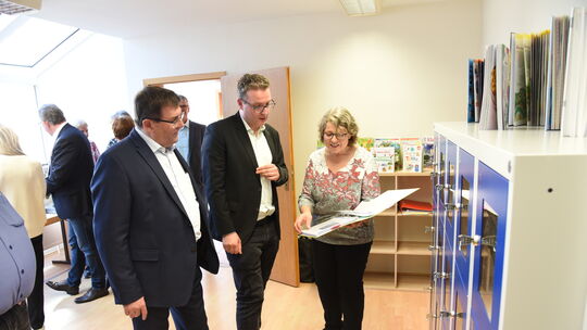 Zur Eröffnung der "Bücherei der Dinge" statteten im vergangenen Jahr Landrat Jörg Denninghoff und Staatssekretär Janosch Littig Hahnstätten einen Besuch ab. Rechts Selma Kärcher-Prüß, Mitarbeiterin der Gemeindebücherei. Uli Pohl