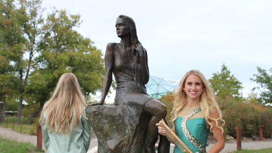 Keine Statuen, sondern sehr lebendige junge Frauen aus der Region: Die noch amtierende Loreley Katharina Blanckart (rechts) freut sich, dass sie eine so tolle Nachfolgerin (links) bekommt. Das Geheimnis, um welche junge Dame es sich dabei handelt, wird bei der Inthronisierung mit geladenen Gästen am Samstag in der Mythoshalle (im Hintergrund) gelüftet. Ulrike Bletzer