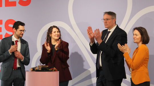 Die Direktkandidaten (von links) Manuel Liguori und Adriana Kauth mit Ministerpräsident Alexander Schweitzer und Katarina Barley, Vizepräsidentin des EU-Parlaments, beim SPD-Empfang im Nastätter Bürgerhaus. Andreas Galonska