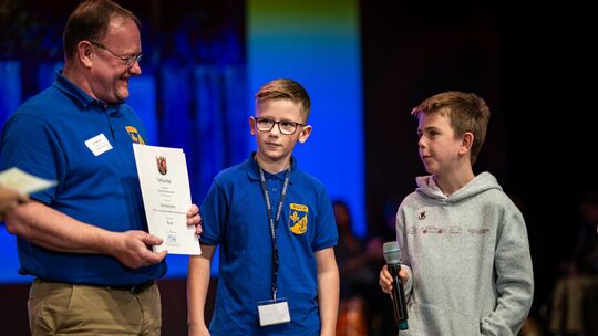 Bürgermeister Jan Menzel mit zwei jungen Reportern der Kuckucks-Zeitung bei der Siegerehrung des Wettbewerbs "Unser Dorf hat Zukunft" in Neustadt an der Weinstraße. DL Fotografie