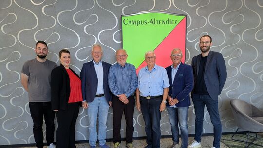 Sie stellten das Projekt für Erinnerungskultur in Altendiez Oranien-Campus vor (von links): Lennart Zwanziger (IT-Team), Kathrin Glaser (Stellvertreterin des Schulleiters und Leiterin der gymnasialen Oberstufe), Jens Feld (Schulleiter), die Altendiezer Ehrenbürger Robert Wiederstein und Theo Zwanziger, Konrad Schuler (Erster Beigeordneter der Ortsgemeinde und Vorsitzender der Ruandastiftung) sowie Jonas Wirschem (Orientierungsstufenleiter und Mitglied des Direktoriums der Schule). Kunz Thorsten