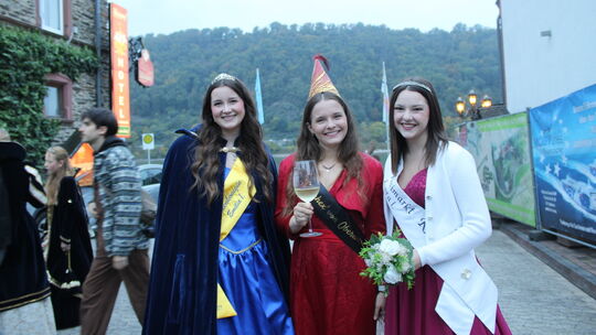 Beim Weinfest in Kamp-Bornhofen trafen sich Hoheiten in unterschiedlichen Phasen ihrer Amtszeit: Während Martinimarktkönigin Lara I. aus Osterspai (rechts) ihr Amt in drei Wochen an die Nachfolgerin übergibt, amtiert Weinhex Eva I. aus Oberwesel (Mitte) noch bis April 2026, und Bienenkönigin Emilia (Iinks) wurde erst vor zwei Wochen inthronisiert. Bletzer Ulrike