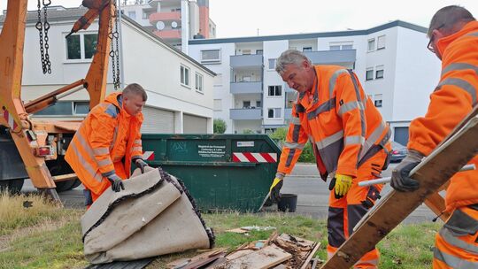 Drei Mitarbeiter der Stadtreinigung Limburg räumen in Blumenrod illegal entsorgten Müll weg. Stefan Dickmann