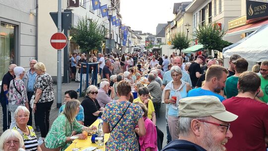 Auf den aufgestellten Bierbänken in der Römerstraße war kaum noch ein Platz frei. Tausende Menschen kamen in die Nastätter Innenstadt, um den Nachtbummel des Gewerbevereins zum Shoppen und Beisammensein zu nutzen. Foto: Alexander Bayer Alexander Bayer
