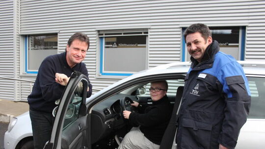 Die Fahrschule im Heinrich-Haus hat Johannes Beils ermöglicht, seinen Führerschein zu machen. Fahrlehrer Frank Schmidt (links) hat dem Kleinwüchsigen mit Umbauten im Auto Fahrstunden gegeben. Bei Prüfer Heiner Etzkorn (rechts) hat der 19-Jährige die Prüfung gemacht. Foto: Nina Borowski
