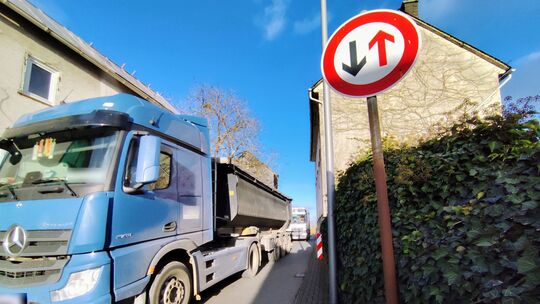 Den Engpass an der Rheinstraße (B274) in der Ortsmitte von Mittelfischbach muss man mal gesehen haben – insbesondere, wenn von beide Fahrtrichtungen Lkw im Anmarsch sind. Denn die B274 verbindet den Einrich mit dem Blauen Ländchen, entsprechend viel Verkehr ist dort unterwegs.