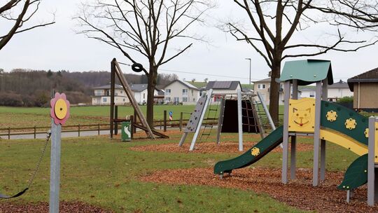 Der Spielplatz auf dem Kreuz soll weiter aufgewertet werden, auch mit Basketballkorb und Bocciabahn. Im Hintergrund sind neue Häuser im Baugebiet am Bettendorfer Weg zu sehen. Thorsten Stötzer