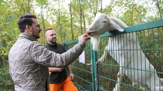 Stadtbürgermeister Oliver Krügel lässt es sich nicht nehmen, die neuen Bauhofmitarbeiter (hier Olaf, eine Deutsche Edelziege) ab und zu mit Kulinarischem zu versorgen. Der stellvertretende Bauhofleiter Max Fischer schaut amüsiert zu. Bletzer Ulrike
