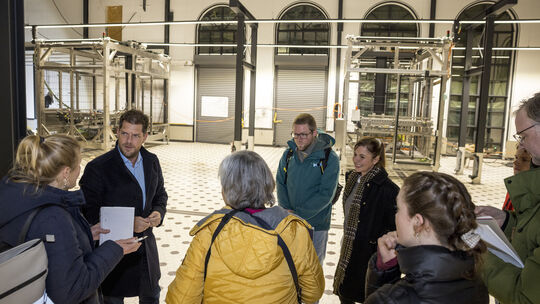 Beim jüngsten Bilanz-Pressegespräch der Hachenburger Brauerei stellten Geschäftsführer Jens Geimer (2. von links) und Marketing-Leiterin Simone Kerschbaum (5. von links) den Journalisten auch die neue Flaschenfüllerei vor, die am 14. März durch Ministerpräsident Alexander Schweitzer eingeweiht werden soll. Röder-Moldenhauer