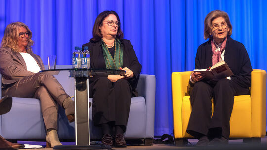 Die 93-jährige Zeitzeugin Eva Szepesi (rechts) schilderte die letzten unbeschwerten Tage vor der Deportation, ihren Aufenthalt im KZ und die Befreiung durch die Rote Armee. Röder-Moldenhauer