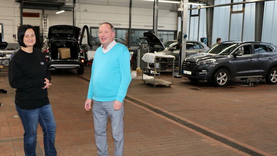 Geschäftsführer Heiko Schlotter im Gespräch mit der Serviceassistentin Nermin Beser-Cetin in der KFZ-Vertragswerkstatt für VW-PKW, VW-Nutzfahrzeuge, sowie für Audi und Skoda. Hans-Peter Metternich