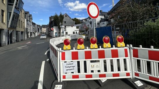 Die Einfahrt "Altstadt I" zur Montabaurer Tiefgarage Mitte ist gesperrt, bis der darunterliegende Stadtbachkanal abgestützt ist. Absperrung und Durchfahrtsverbot hat die Verwaltung wegen vieler Falschfahrer um den Hinweis "Zufahrt Tiefgarage gesperrt" ergänzt. Katrin Maue-Klaeser