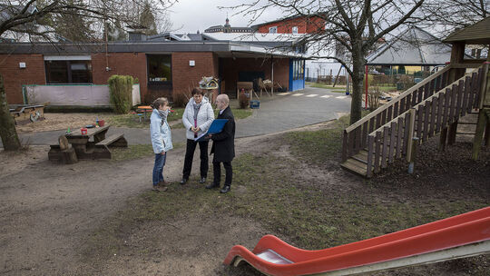 Die kommissarische Kita-Leiterin Martina Ernst (von links), Kirchenvorstandsvorsitzende Susanne Pütz und Pfarrer Hilmar Lenz freuen sich auf die Krippe, die an den Evangelischen Kindergarten angebaut wird. Foto: Röder-Moldenhauer Röder-Moldenhau