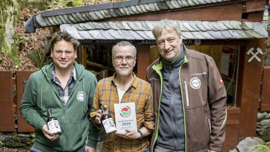 Jan Bosch (links) und Michael Volkwein (rechts) vom Geopark Westerwald-Lahn-Taunus überreichten dem Vorsitzendenden des Limbacher Kultur- und Verkehrsvereins (KuV), Martin Schüler, die Auszeichnung "Geotop des Jahres" für die Dachschiefergrube Assberg, die seit 25 Jahren als Besucherbergwerk genutzt wird. Röder-Moldenhauer