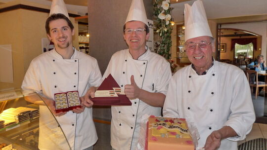Drei „Künstler ihres Faches“: die Konditorenmeister Michael, Wolfgang (mit einer Schachtel des Dernbacher Dreiecks in der Hand) und Josef Görg (von links). Handwerkskammer Koblenz