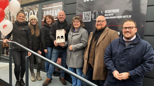 Über die neue Botte-Box in Montabaur freuen sich (von links) Luisa, Lara, Annette und Markus Botte sowie Stadtbürgermeisterin Melanie Leicher, City-Manager Oliver Krämer und VG-Wirtschaftsförderer Alexander Klinge. Hans-Peter Metternich