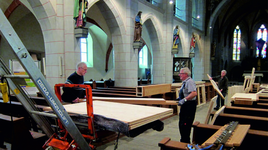 Freiwillige Helfer des Kirchbauvereins packten mit an, um die teilweise schweren und sperrigen Elemente auf die Orgelempore zu bringen. Kirchbauverein