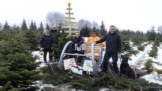 Die komplette Familie Kaiser aus Luckenbach inmitten ihrer Weihnachtsbaumkultur mit dem riesigen, selbst gebauten Schlitten. Karl-Heinz Kaiser