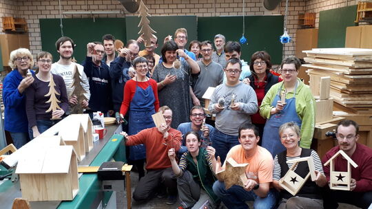 Eine Gruppe von 18 jungen Erwachsenen hat mit acht ehrenamtlichen Betreuern des Vereins „ Gemeinsam ist es möglich“ in der Berufsbildenden Schule Montabaur an zwei Wochenenden schöne weihnachtliche Dekorationen aus Holz geschaffen, die nun auf dem Montabaurer Weihnachtsmarkt verkauft werden. Foto: Gemeinsam ist es möglich Verein Gemeinsam