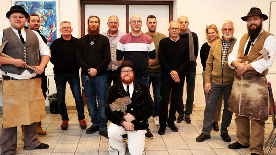 Sie haben gerne den Dank für eine hervorragende Arbeit m Westerwälder Dom entgegengenommen: Handwerker, Gutachter und Architekt. Kniend der Steinmetz Ricardo Linz, der sich mit einigen seiner Kollegen in typischer Kleidung der Steinmetzgilde dem Fotografen stellt. Hans-Peter Metternich