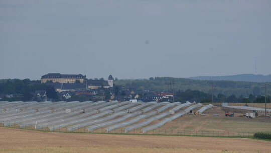 Wer aus Richtung Hattert-Hütte zum Schloss Hachenburg mit der Schlosskirche schaut, kann den neuen Solarpark nicht übersehen. Während schon die Halterungen für die Solaranlagen montiert sind, wurden auch gerade in großen Kartons stapelweise Solarmodule angeliefert.