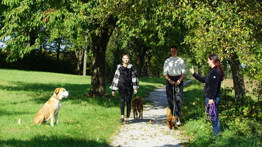 Hört der Hund beispielsweise dein Signal „Sitz“, wird das neuronale Netzwerk erregt. Es entsteht ein elektrischer Impuls, der mit enormer Geschwindigkeit durch seinen Körper bis in die Muskeln rast. Diese setzen die Knochen in Bewegung, der Hund setzt sich. Die hohe Kunst ist, wenn dies auch bei Ablenkung - wie hier durch die zwei Hunde - funktioniert. Chris Denzin